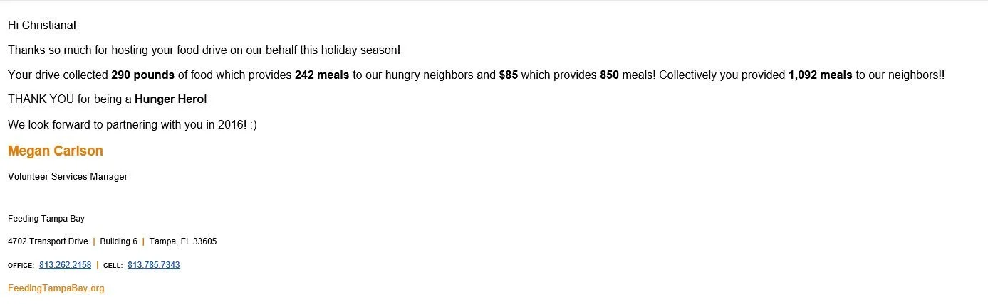 We raised all this food in the space of four hours at the Tampa Bay Area Meetup's Holiday Open House 2105 at Beef O'Brady's in Land O' Lakes, Florida.