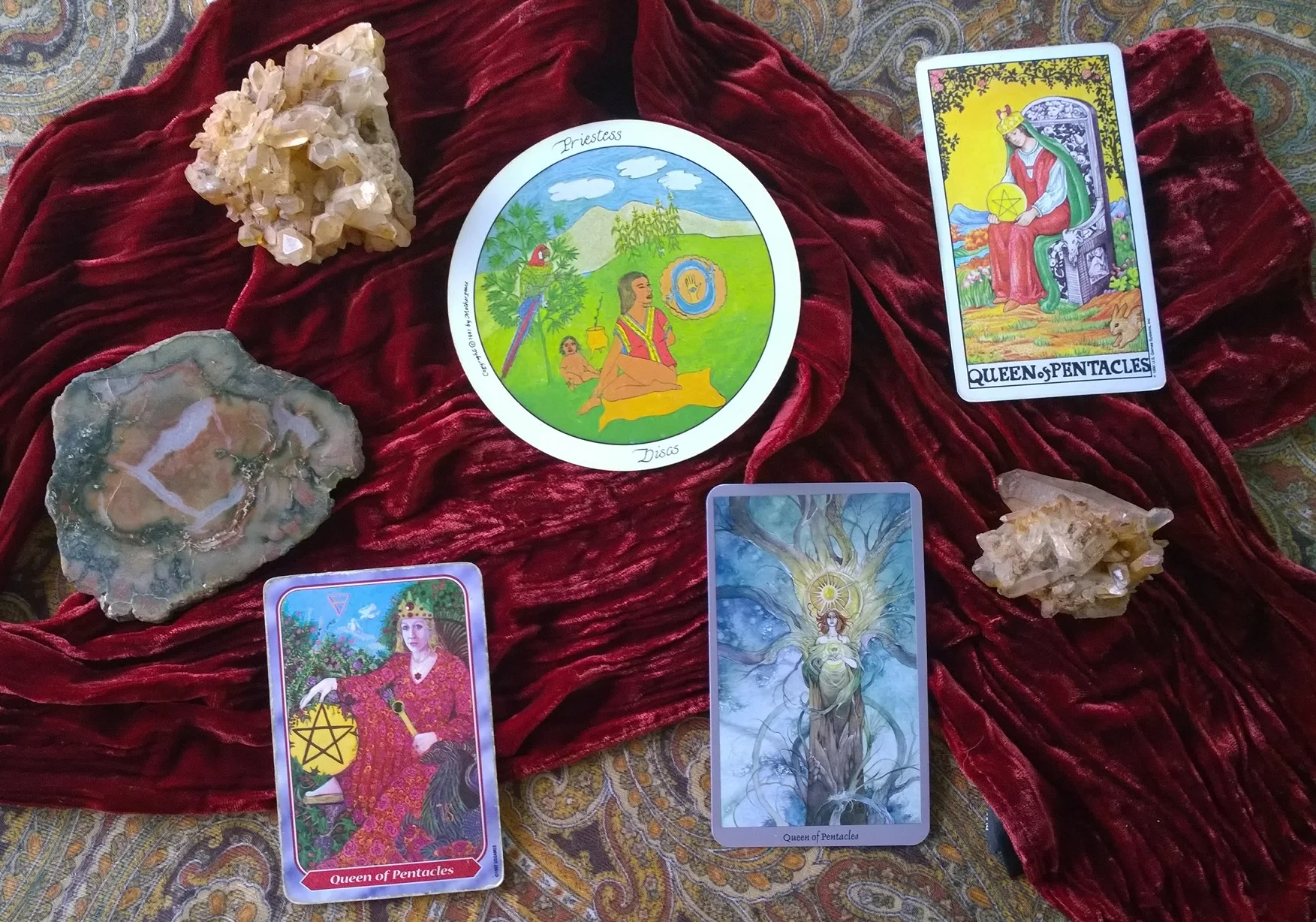 The four Queens can each predict or discuss a particular issue, action or situation. The Queen of Pentacles may relate to business or motherhood. The Queen of Cups may predict a romance. The Queen of Wands may promote creativity. The Queen of Swords may describe loneliness, or the need to speak a hard truth, or make a hard choice.