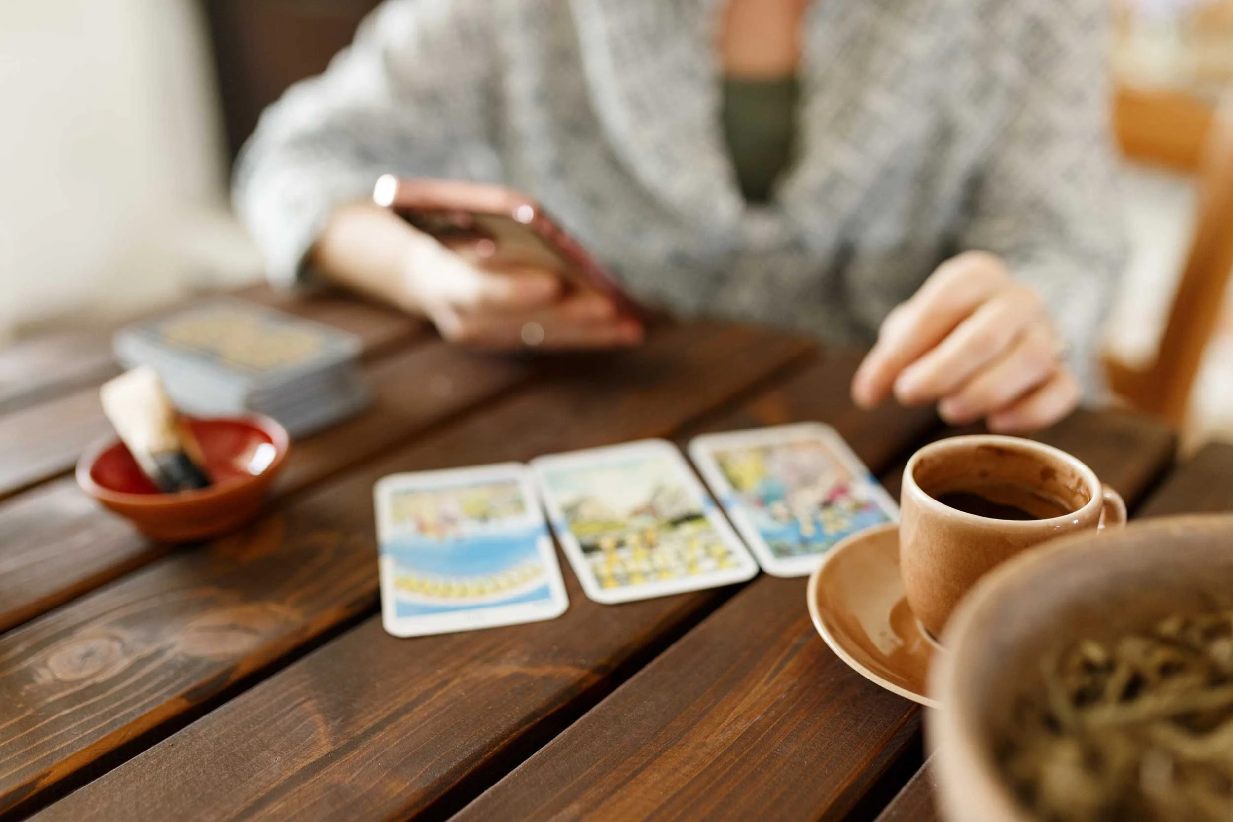 Tarot cards on a wooden table with cups and a bowl of fruit.