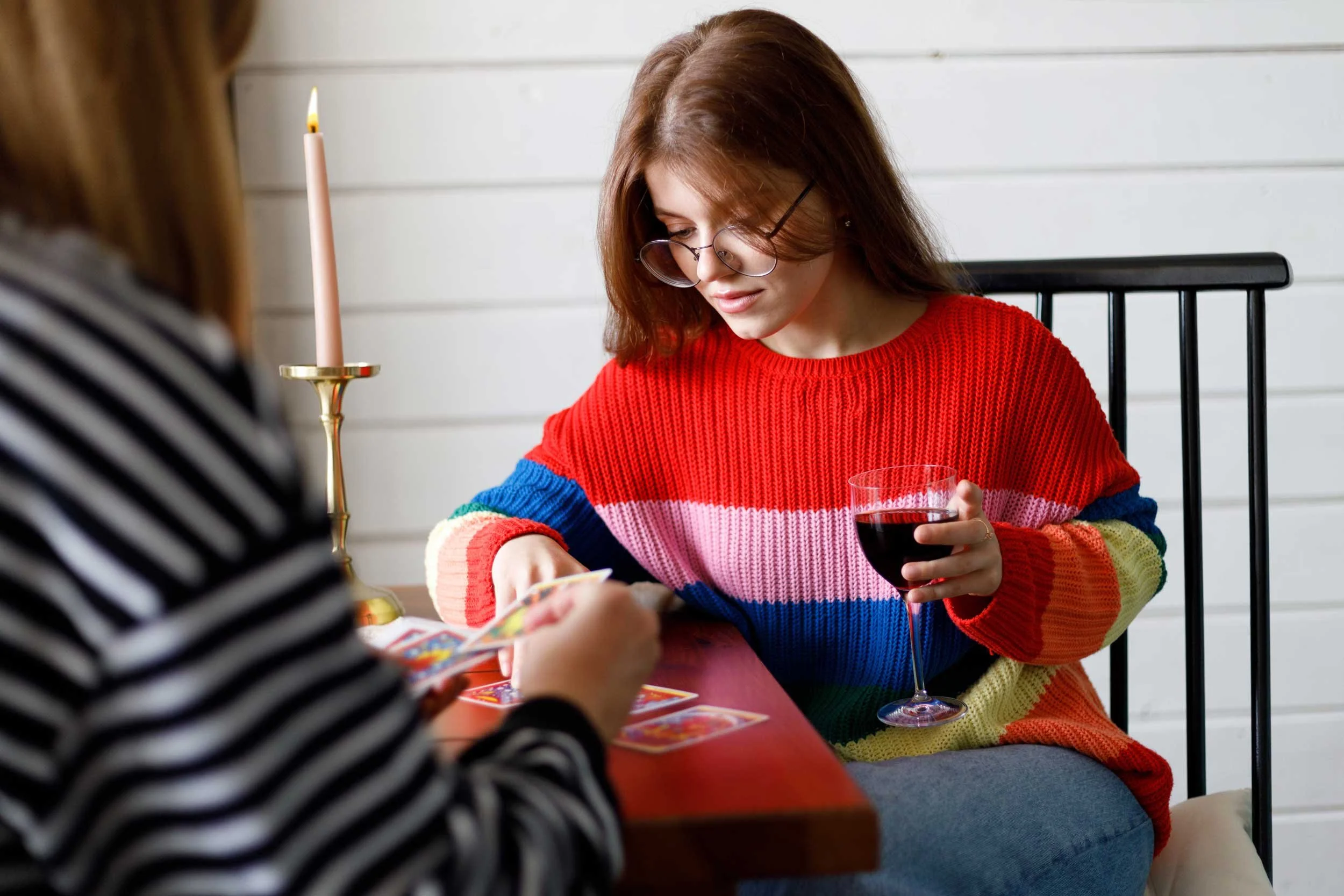 One woman reads tarot for another.