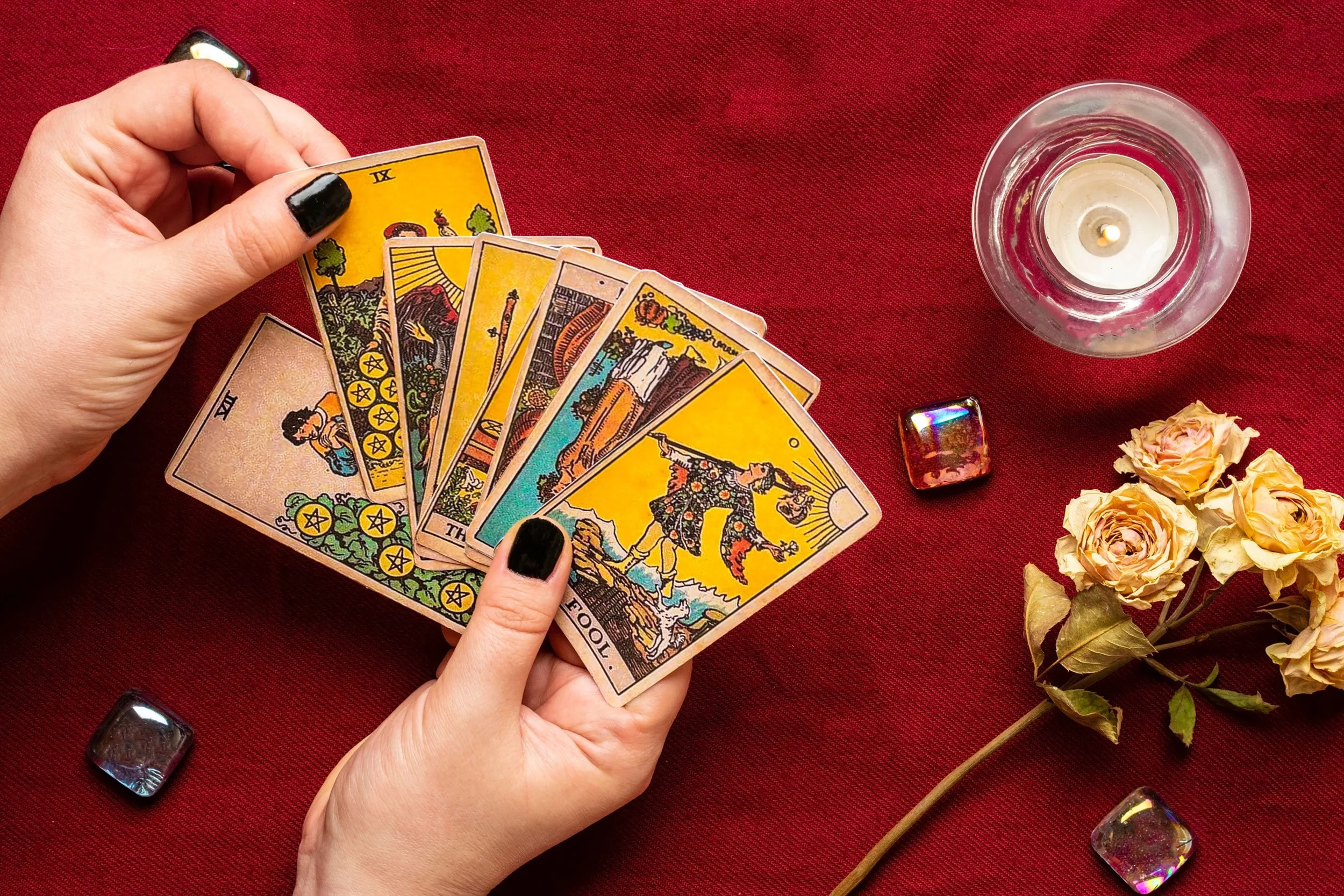 Closeup of a hand holding tarot cards next to a candle and yellow roses.
