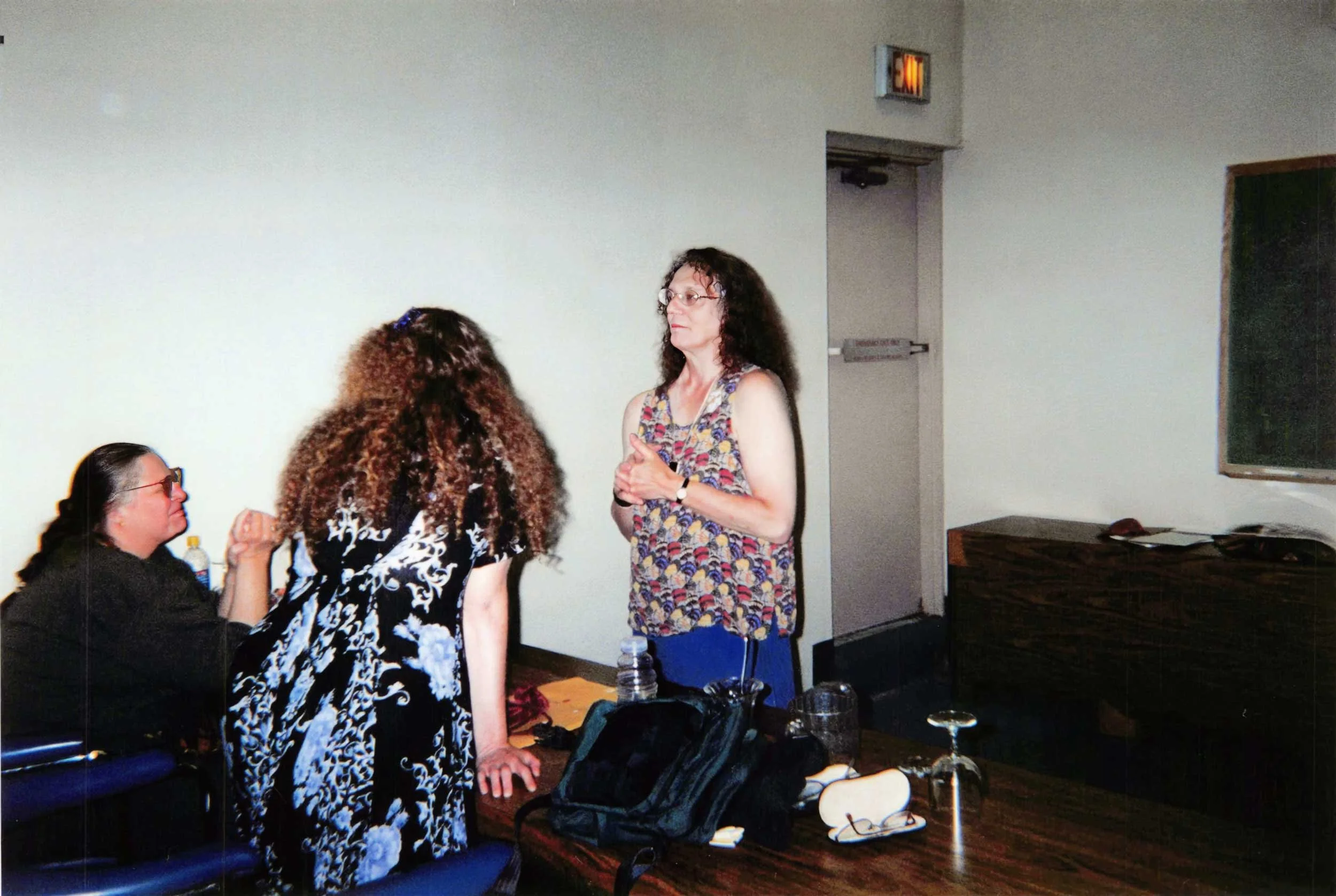 Christiana Gaudet speaking with Rachel Pollack and another conference attendee, ATA Regional Conference, July 2001.