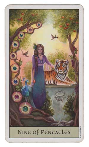 Today, the Nine of Pentacles is often interpreted as being comfortably alone, comfortable in oneself, and personally and emotionally secure. While the Nine of Pentacles is still a card of financial security, we also now interpret this card to include the concept of emotional security as well.