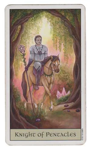 The Knight of Pentacles may appear in a reading to advise the pursuit of a new job, or perhaps even a new health regimen. In this context, the Knight of Pentacles advises pursuit of the Earth element, that is, stability, wealth, or resources.