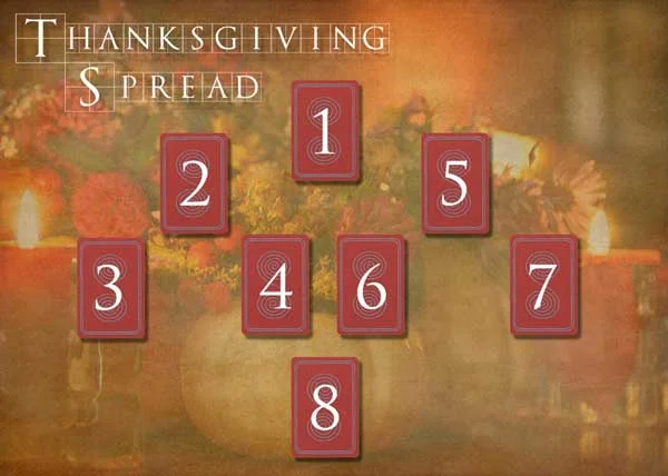 This spread focuses on a person we are thankful for. While it might be a friend, lover, or parent, this person needn't have been directly active in our life during the past year. The person identified by the court card may have been an influential teacher from your childhood or someone who departed much wisdom before they passed. The spread allows great scope and can be performed more than once. It asks 'Who are you truly thankful for and why have these people been important on your life journey?'.