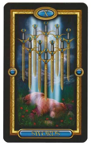 The Ten of Swords is typically regarded as a card that discusses difficulty. This card asks you to think about the things that are really hurting you right now, whether real or imagined.