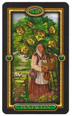 The Seven of Pentacles reminds us to keep at our task. No matter how bleak things look, if we continue to nurture the garden, it will most certainly bear fruit.