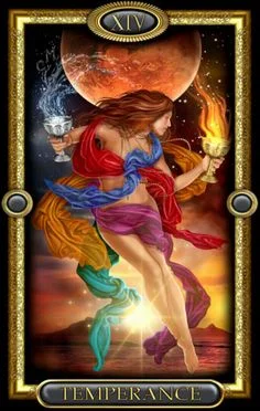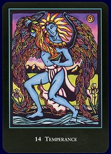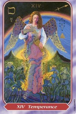 Temperance is the card of art, time and alchemy. When we think of these three ancient key words for this card, we get a deeper sense of its meaning. The angel is an alchemist, carefully and patiently mixing the ingredients together to create the perfect blend.